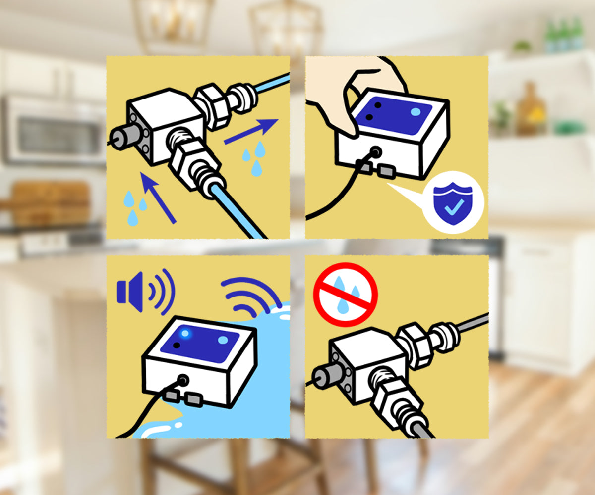 It works by using a built-in metal sensor to detect water leaks and automatically shutting off the water supply to prevent further damage. For optimal performance, please place the device with its back facing down in a low-lying area where water is likely to collect.